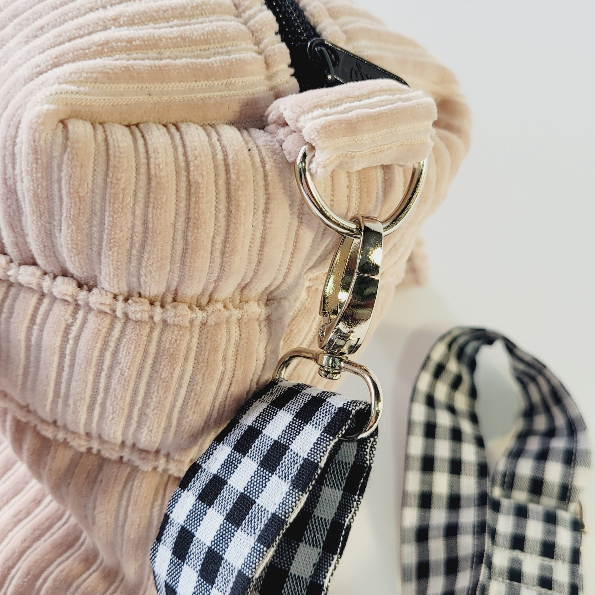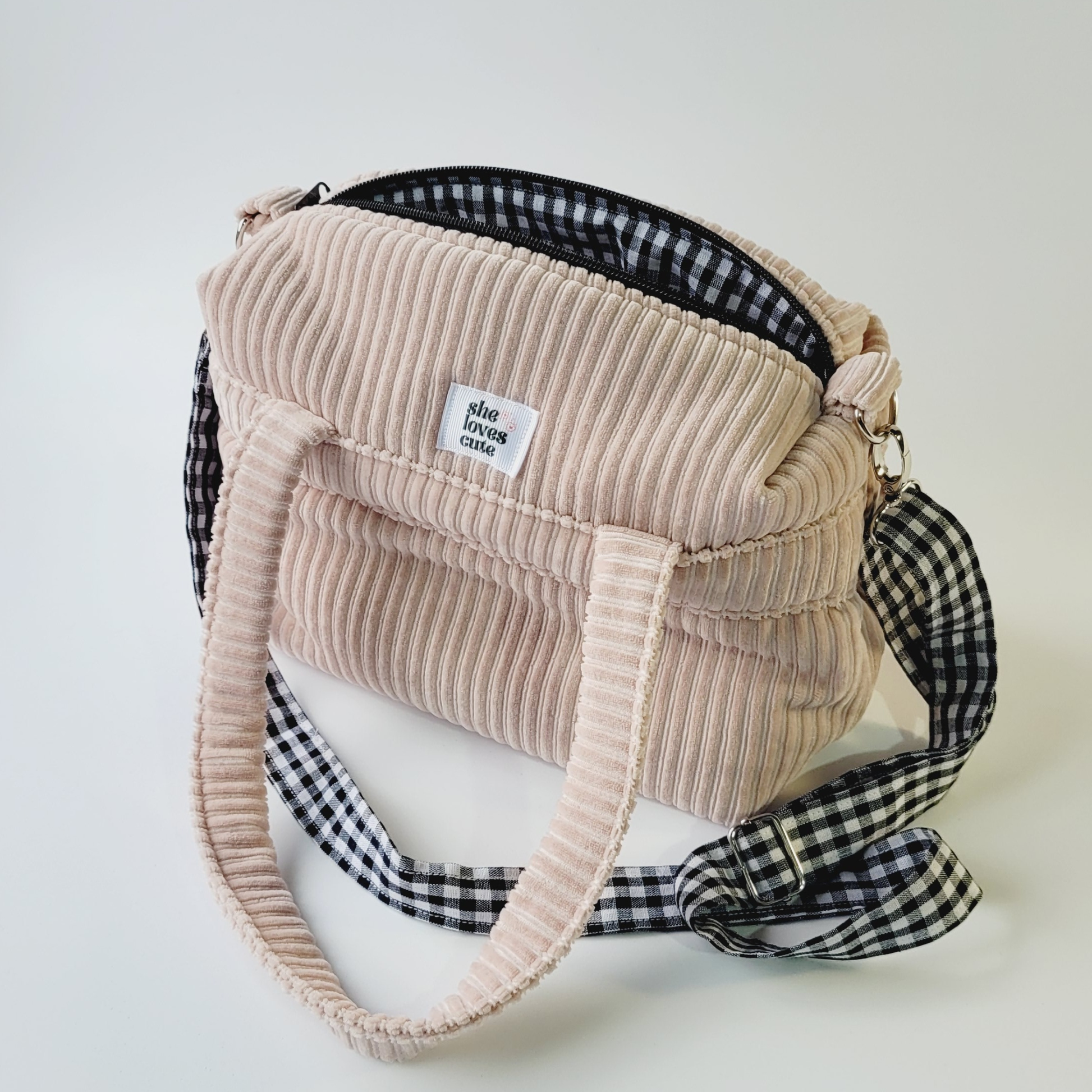 Feita à mão em bombazine rosa velho, com interior em vichy preto, combina suavidade e elegância num design compacto, mas surpreendentemente espaçoso.