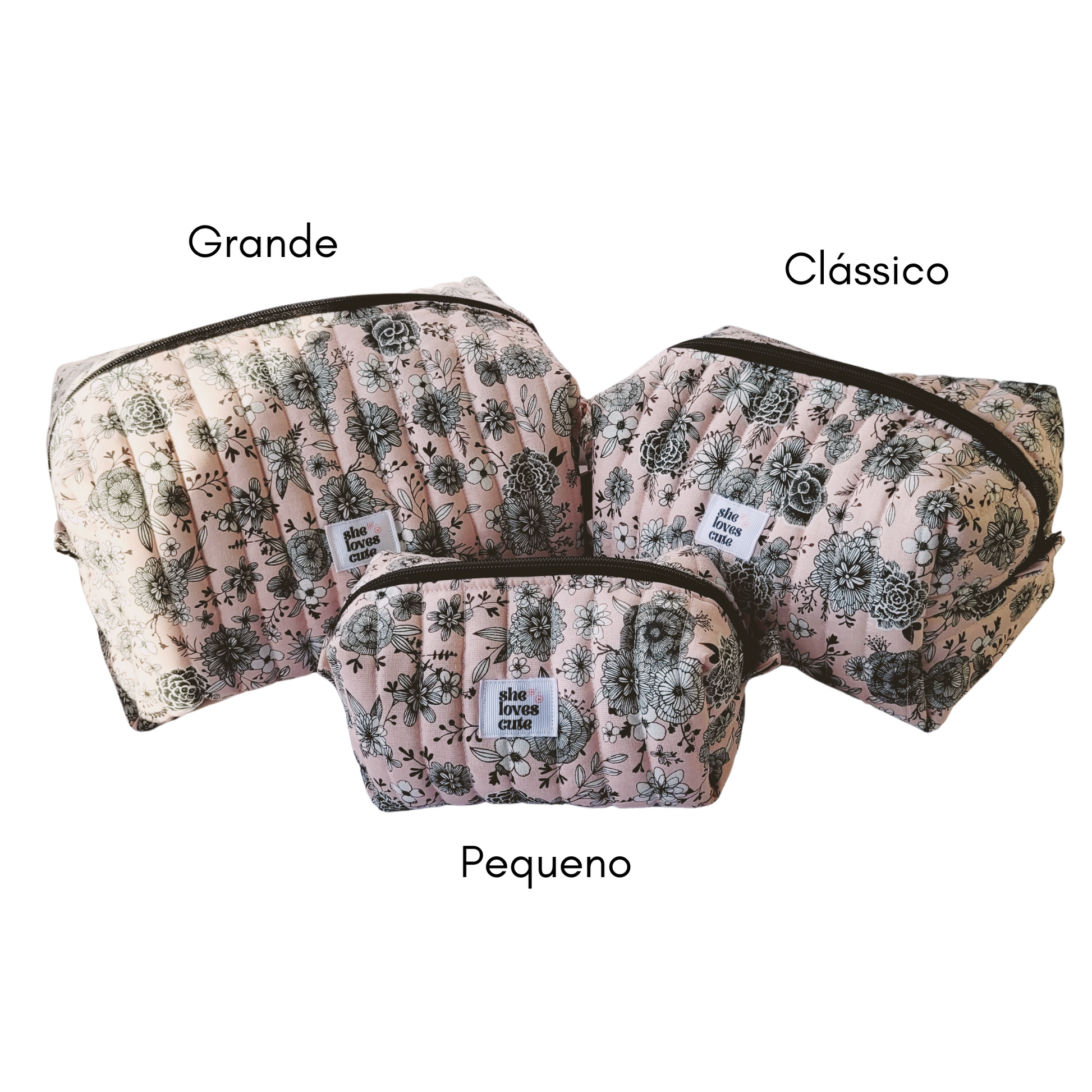 - Pequena: perfeita para levares na tua mala do dia a dia — cabe maquilhagem, essenciais de beleza ou pequenos objetos que queres sempre à mão.
