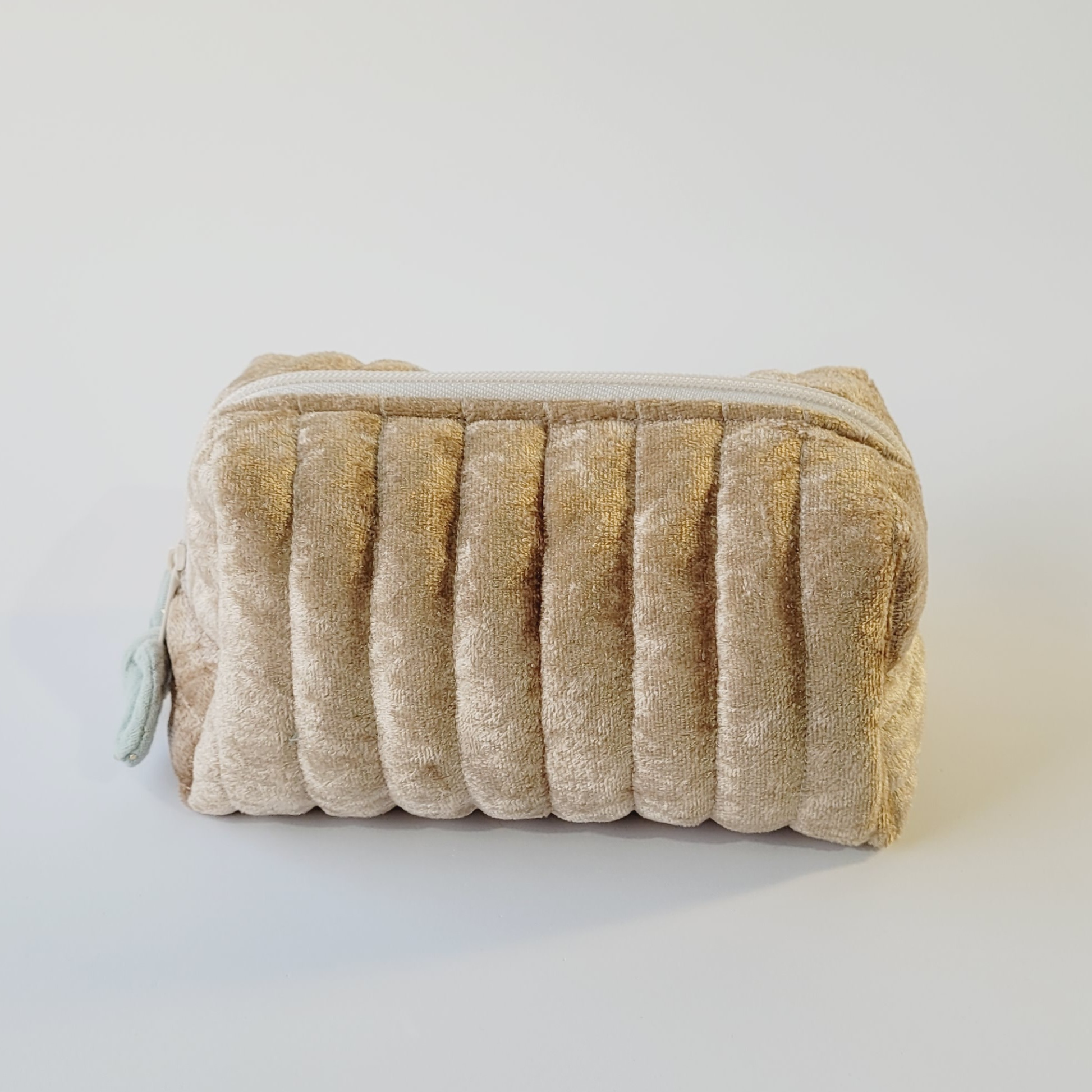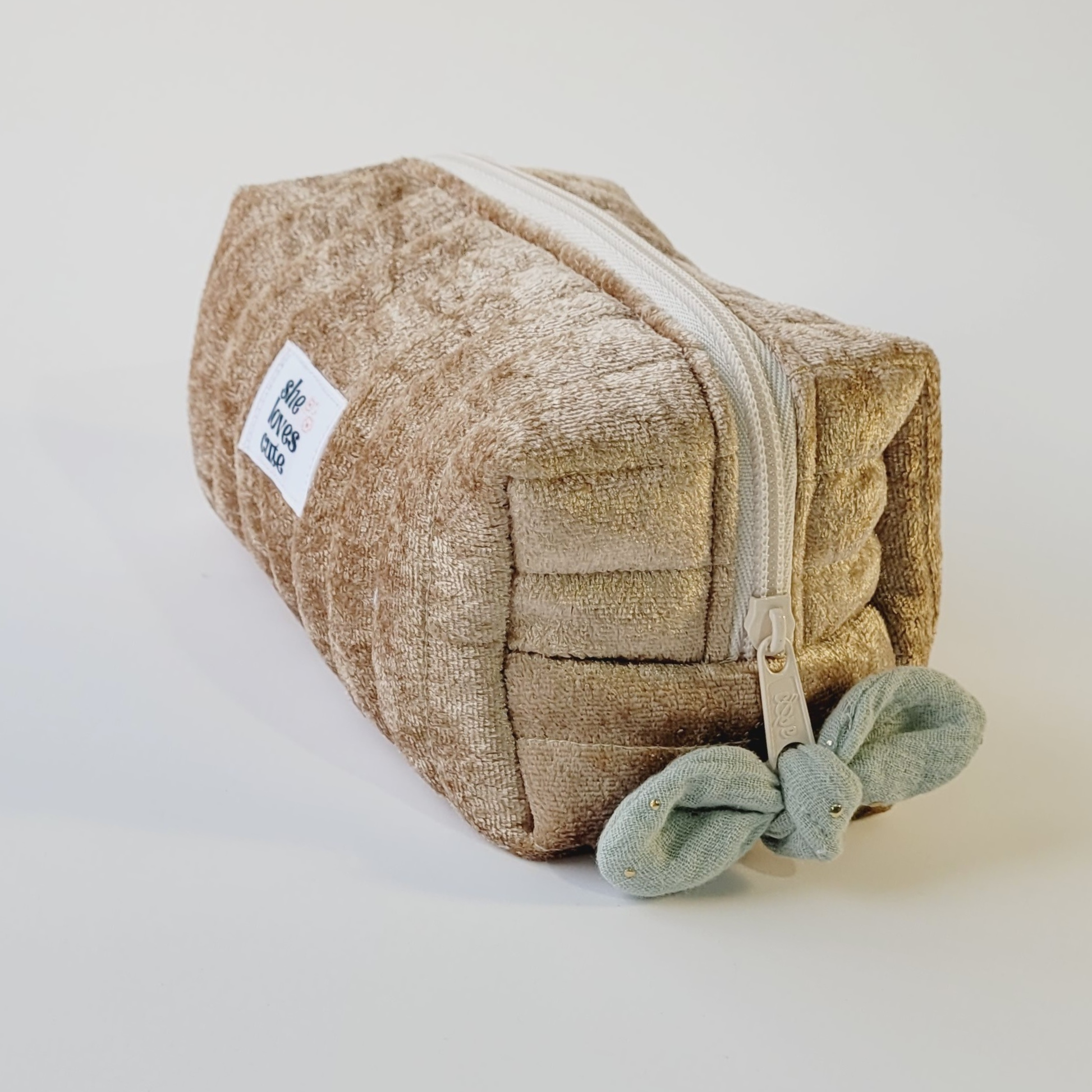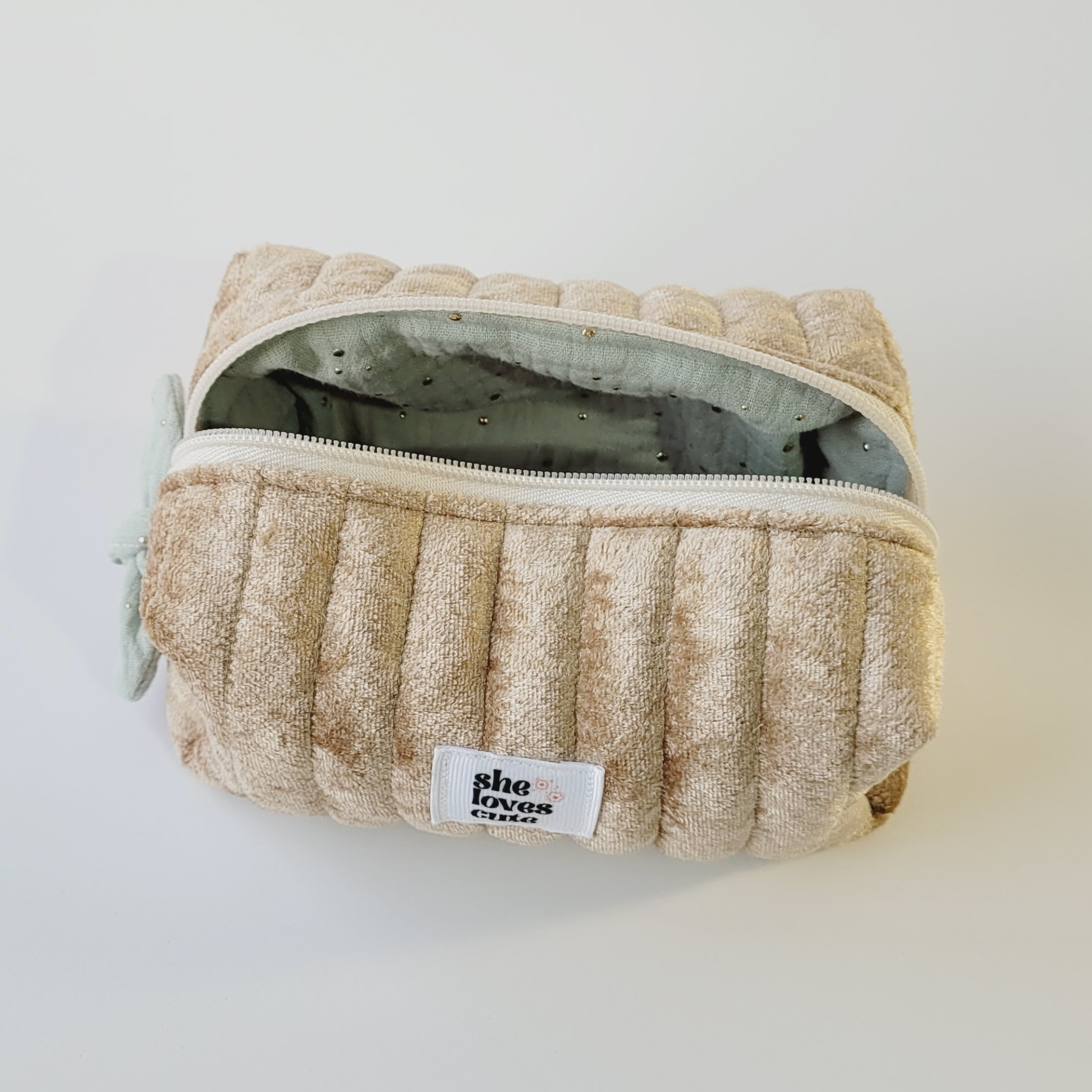A Makeup Bag Golden é a nova necessaire She Loves Cute — feita à mão em veludo dourado luxuoso com interior verde sage pontuado a dourado.